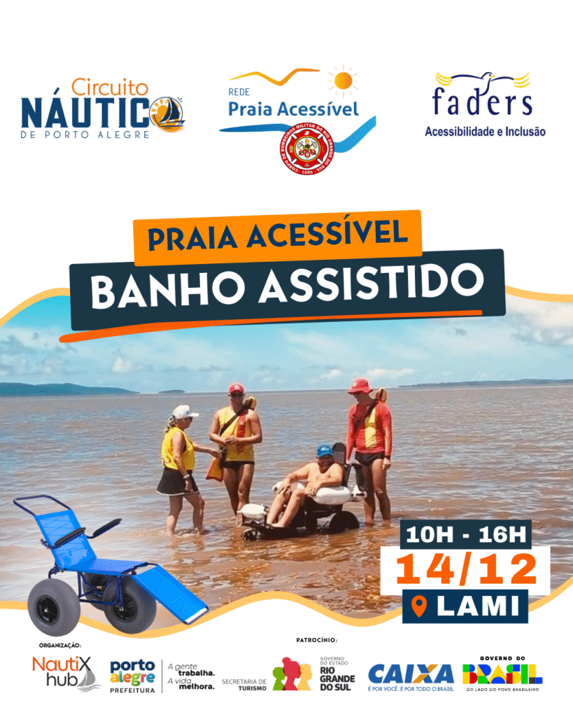 No dia 14 de dezembro, das 10h até às 16h, a Praia do Lami recebe a ação Praia Acessível, promovida pela Faders Acessibilidade e Inclusão, em parceria com o CBMRS (Guarda-vidas), dentro da programação do Circuito Náutico. O objetivo é simples e profundo: garantir que pessoas com dificuldade de locomoção — seja por idade, mobilidade reduzida ou deficiência — possam viver um momento de conexão real com o Lago Guaíba, com segurança, acolhimento e autonomia. O banho assistido com cadeira anfíbia oferece acesso ao estuário de forma digna e confortável, sempre acompanhado por uma equipe preparada. É uma oportunidade para famílias e cuidadores proporcionarem uma experiência que amplia horizontes, fortalece vínculos e celebra o direito de todos de estar na água. O Circuito pensa em cada pessoa. O Guaíba também. 🌊 Venha viver esse momento com a gente.