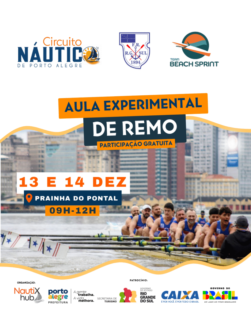 A modalidade esportiva do remo olímpico, centenária em Porto Alegre, estará presente no Circuito de um jeito especial. Nos dias 13 e 14 de dezembro, das 9h às 12h, a Federação de Remo do Rio Grande do Sul, junto aos clubes de remo da cidade, vai integrar a programação do Circuito Náutico de Porto Alegre, apresentando o esporte ao público e oferecendo aulas introdutórias gratuitas na Prainha do Pontal. É a oportunidade perfeita para conhecer de perto uma das tradições esportivas mais importantes da nossa história, sentir o movimento das remadas e experimentar a conexão única entre corpo, água e ritmo. Instrutores estarão no local para orientar iniciantes com segurança e acolhimento. Basta chegar e viver essa experiência transformadora. 🌊✨ Traz protetor solar, boné e a tua garrafinha de água! Não requer inscrição, serão realizadas aulas das 9h às 12h. É só chegar! Traz um quilo de alimento para doar! 🥫🥫🥫